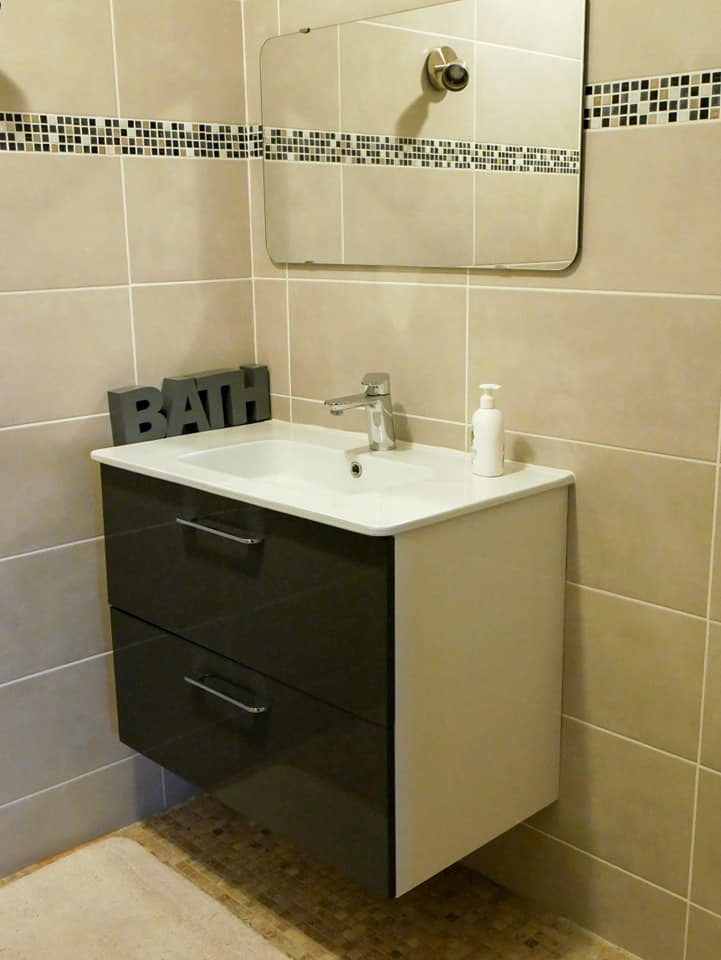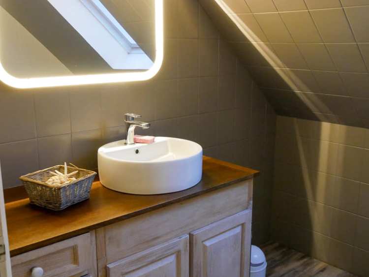 La chambre du bas avec sa salle de bains attenante (douche à l’italienne). Cette chambre est accessible aux personnes à mobilité réduite