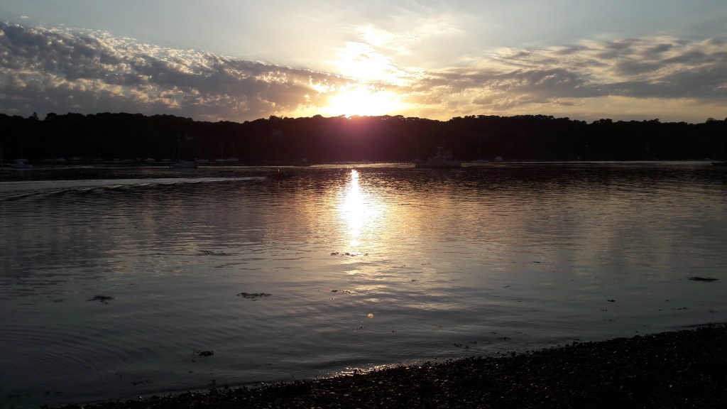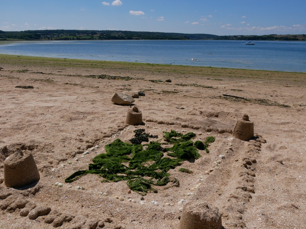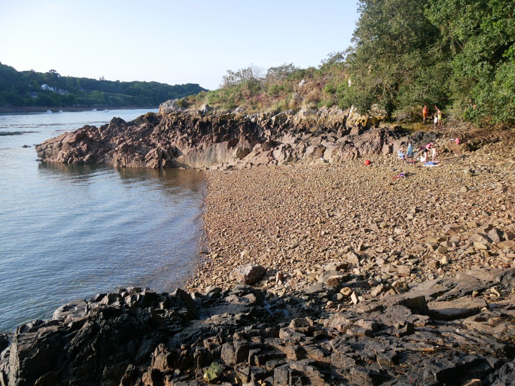 Comme tout le monde on aime les plages de sable, nos pieds surtout les apprécient mais seulement voilà……. on n’aime pas forcément prendre la voiture, on a des chiens, des enfants bruyants, on est en troupeau et quand il fait beau, l’envie d’aller se baigner peut nous prendre tout d’un coup, à n’importe quelle heure……bref ce qu’on fait, on met des chaussures de marche, on prend des vieilles baskets ou de ravissants petits chaussons de baignade et on part à pieds, à travers bois pour rejoindre le Trieux où on trouve un coin qui nous plaît.